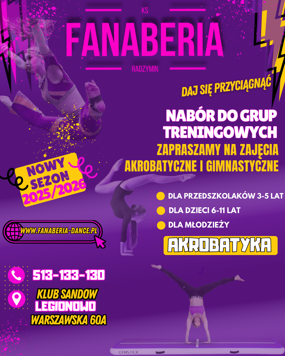 Wszystkie osoby rozpoczynające swoją przygodę akrobatyczną z Klubem Sportowym Fanaberia proszone są o wypełnienie formularza zgłoszeniowego na zajęcia akrobatyczne w sezonie 2025/2026. Identyczne zgłoszenie wypełniają osoby,które zdecydowały się kontynuować naukę.